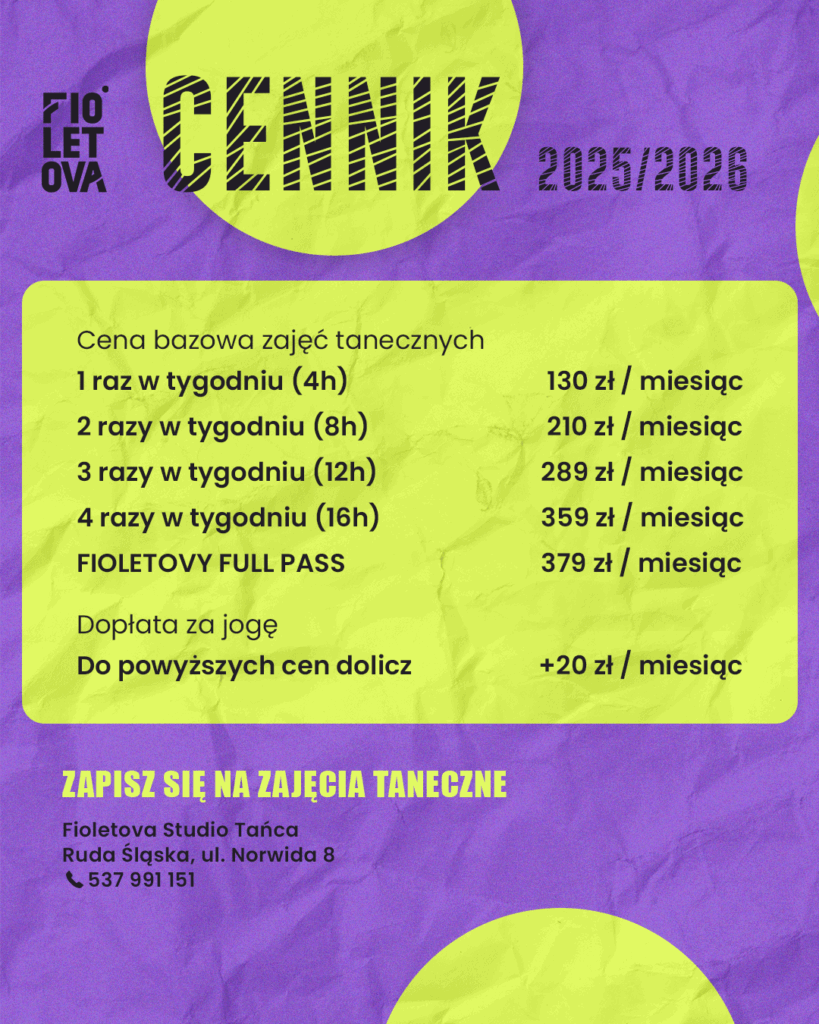 CENNIK PIERWSZY TANIEC 1 lekcja (1h) 4 lekcje (4h) 6 lekcji (6h) 200 zł 650 zł 850 zł Wynajem sali na wyłączność (1h) 100 zł Zniżka rodzinna: -20 zł na kolejnego członka rodziny